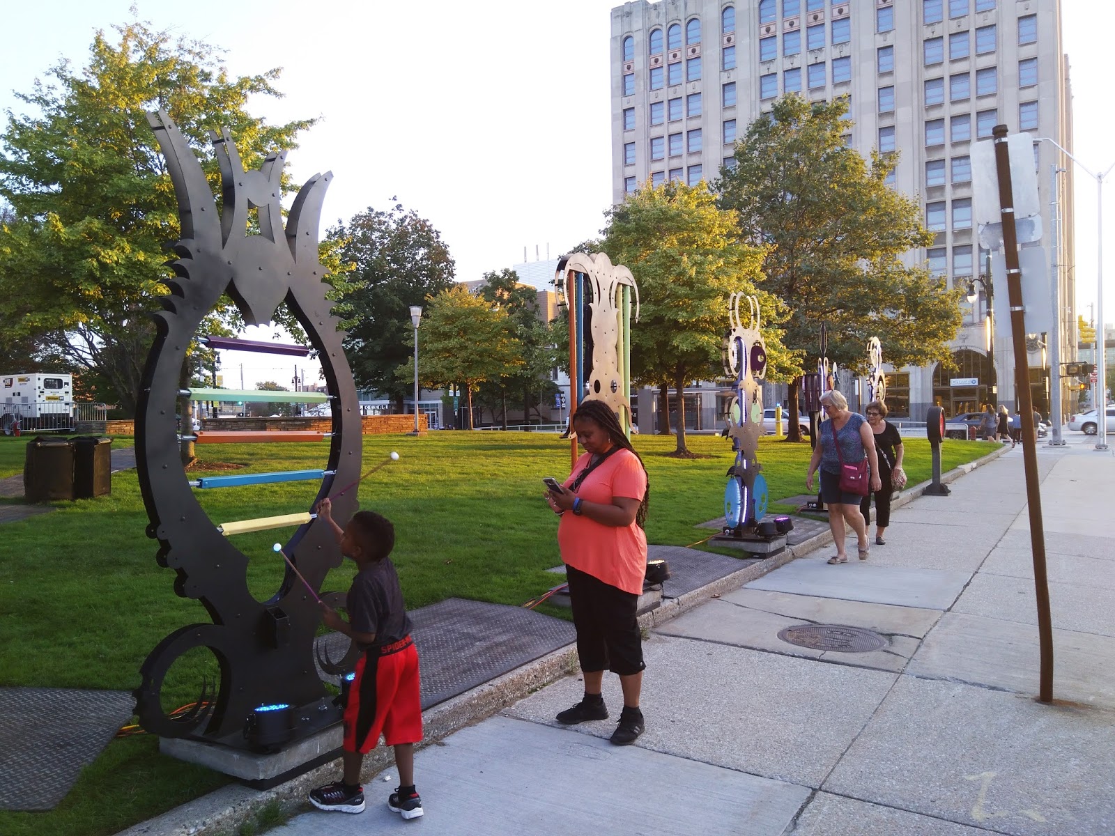 Jake Chidester and Alisyn Malek of Corktown Studios presents The Sidewalk Ballet AKA The Arkestral Procession, a novel series of mechanical archways that amplify a visitor’s movements into light and sound.
